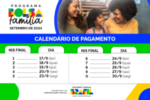 OBolsa Família registra em setembro 20,71 milhões de famílias contempladas nos 5.570 municípios brasileiros. O número total de pessoas beneficiadas diretamente é de 54,3 milhões de brasileiros. Com valor médio de repasse de R$ 684,27, o investimento do Governo Federal chega a R$ 14,14 bilhões. O cronograma de pagamento tem início nesta terça-feira, 17 de setembro, e segue até o dia 30, de acordo com o final do Número de Identificação Social (NIS) dos beneficiários (tabela abaixo).