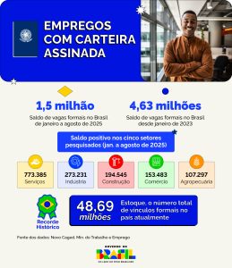 Brasil superou a marca de 1,5 milhão de novos empregos com carteira assinada nos oito primeiros meses de 2025. Entre janeiro e agosto, foram criados 1.501.930 vínculos formais, com saldo positivo nos cinco grandes grupamentos de atividades econômicas. O resultado eleva para 48,69 milhões o estoque de vínculos no país, um recorde absoluto. Desde o início da atual gestão do Governo do Brasil, em janeiro de 2023, o saldo é de 4,63 milhões de vagas com carteira assinada.