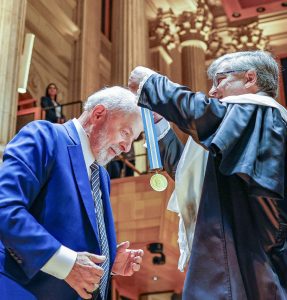 Mas eu quero cumprimentar a USP por um motivo muito especial. A cada dia que passa, ela vai ficando cada vez mais com a cara do Brasil. Uma cara que é preta, uma cara branca, uma cara parda, uma cara indígena. Não é mais a USP pensada para que São Paulo oferecesse ao Brasil a inteligência para governar esse país, mas é a cara do povo brasileiro da periferia, que, durante muitas décadas, nem sonhava em chegar na USP, e hoje é praticamente mais da metade da USP e isso é um prazer extraordinário.