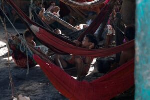 Fernando Frazão/Agência BrasilCrianças yanomami descansam em redes dispostas em cômodo de construção indígena tradicional