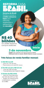 Novo programa do Governo do Brasil facilita acesso a crédito para reformas e ampliações de residências. Com juros baixos, prazo elástico e sem burocracia, novidade estará disponível a partir de 3 de Governo do Brasil lançou nesta segunda-feira um novo programa habitacional para facilitar o acesso a crédito com juros baixo para reformas, ampliações e adequações de moradias em todo o país. São R$ 40 bilhões disponíveis para ações como uma troca de piso, um ajuste no telhado, ampliar a varanda, acrescentar um quarto novo ou construir a cozinha dos sonhos. O objetivo é assegurar o direito à moradia digna, promover inclusão social e urbana e movimentar a economia, com geração de emprego e renda na cadeia da construção civil. Confira abaixo como o programa vai funcionar.